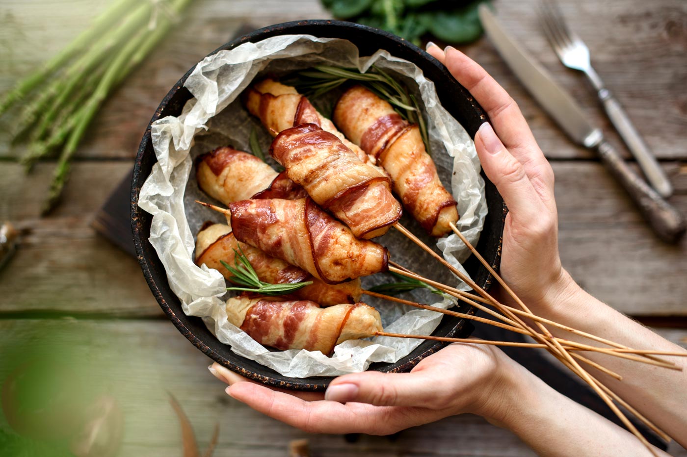 These ones you aren’t cooking in advance, just preparing. Wrap the sausages in bacon, and, you’ll see a theme here, put them in the freezer and then simply roast from frozen on the day.