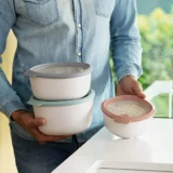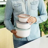 This 3pc covered bowl set is great for serving, displaying and storing various kinds of snacks, dishes and treats. The eco-friendly materials are pleasant to touch and easy to clean while its neutral tone only enhances your food’s vivid colours. On top of that the lid has a built-in air-vent which makes it easy to heat up meals.