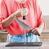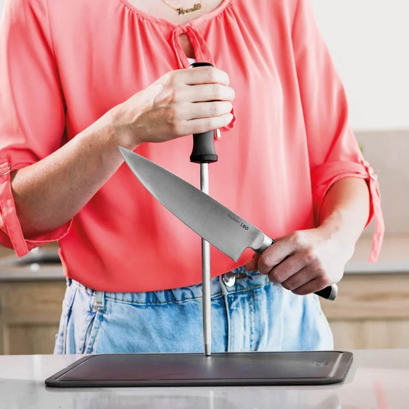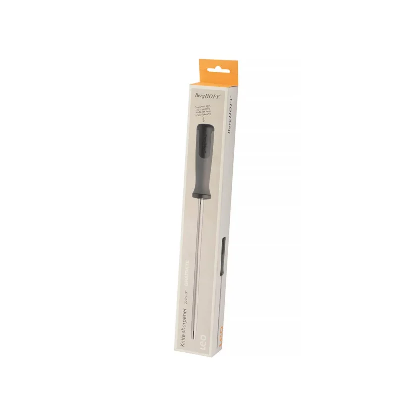 This sharpener makes the Graphite range fully complete. An easy to handle, safe and durable knife sharpener that even fits in the 13pcs knife block set Graphite. The handle is made out of soft touch abs material to use it safely . The very high-quality stainless steel ensures easy sharpening of the blades and a durable characteristic